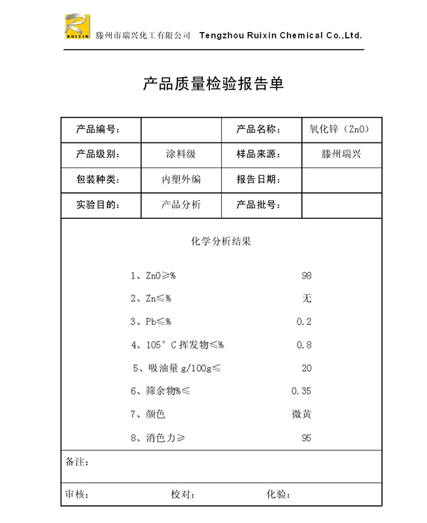 瑞興化工有限公司是生產氧化鋅的重點企業,于2008年通過ISO9001:2008質量管理體系認證。“瑞興”牌氧化鋅在國內擁有較大穩定的市場,并遠銷東南亞、中東、中南美等國家和地區,在國內外享有較高聲譽。